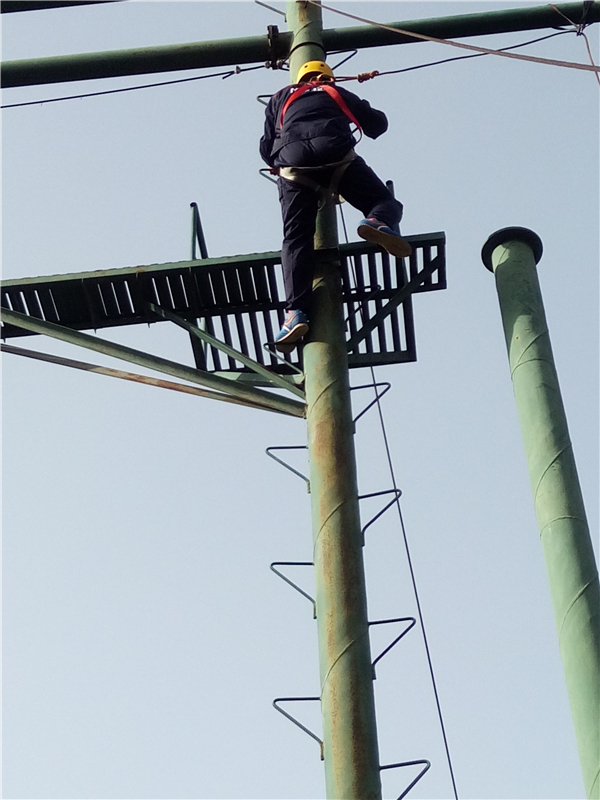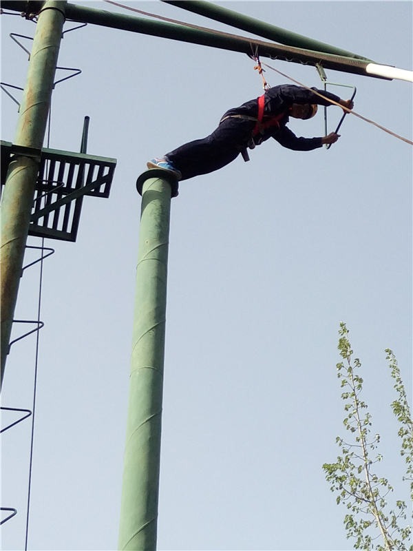 ? ? 這個(gè)項(xiàng)目是“高空抓杠”。要求隊(duì)員依次獨(dú)立的爬上立柱,在圓盤上站穩(wěn)后,雙腿同時(shí)用力蹬出,雙臂前伸抓住掛在前方的單杠。
